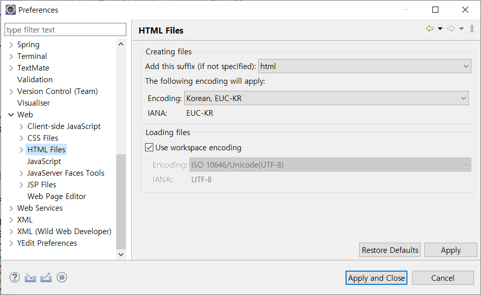 상단 메뉴에서 window->preferences->web에 들어가보면 css/html/js/jsp등의 인코딩 타입을 설정할 수 있다.