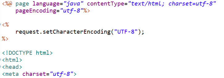 위처럼 JSP페이지 내에서 한글을 처리하는 방법으로는 <%@ %>태그내에서 contentType속성에서 charset을 설정해 줄 수 있고 <% %>태그를 사용하여 java코드로 인코딩을 지정해 줄 수 있다. 또 meta태그에서도 설정해 줄 수 있다.